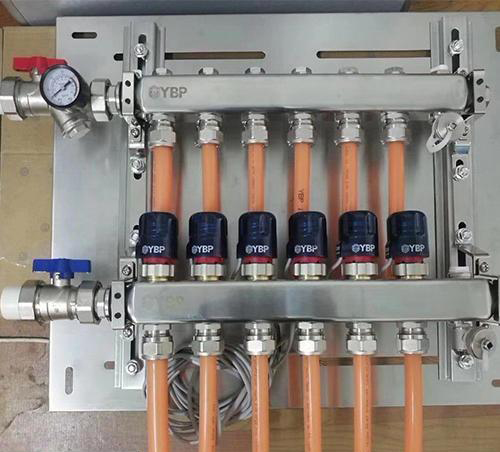 Tips:为防止热量流失,要为分集水器到安装房间的这段管道套上专用保温套。将套好保温套的管道连接到分集水器处,并把管道的一头连在它的温控阀门上。管道铺好之后,把管道的这头套上再传回分集水器固定好。