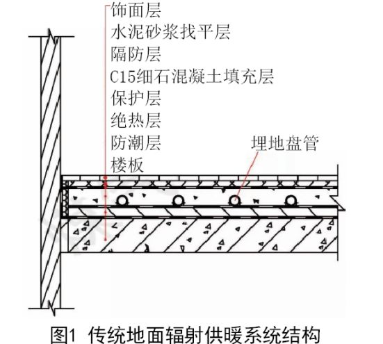 如果采用集中式空调系统,散热器采暖保证室内湿热环境,管道分离比基本能满足要求。若室内供暖系统采用传统地面辐射供暖系统(见图1),由于埋地线管长度较大,管道分离比例过低,无法达到GB/T51129-2017中表4.0.1对于管道分离比例的要求,控制地面辐射供热系统的管道分离比例尤为重要。