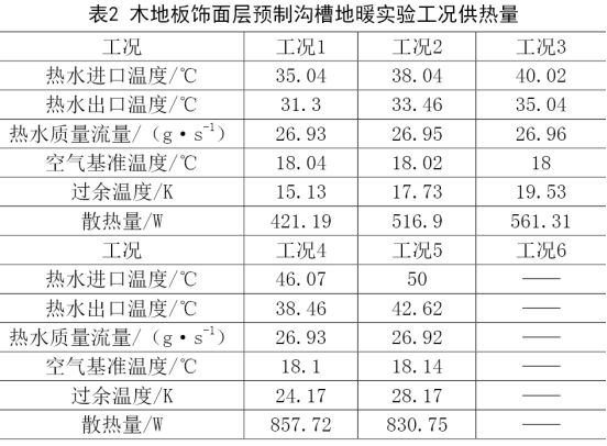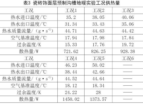 ③性能对比:过余温度取19.5K,分别代入式(2)、(3),可计算木地板,瓷砖分别作为装饰层样品散热分别为577.3W,927.7W,根据计算结果,当辐射面积一定时,瓷砖作为装饰层的预制沟槽地面辐射加热系统比木地板作为装饰层的加热能力更强。