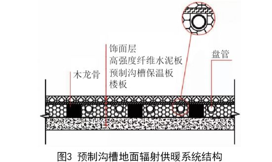 ②预制沟槽形式:见图3。采用木龙骨作为支撑,盘管安装在预制沟保温板中,对房间净高影响小,加热效率高,缺点是预制沟保温板强度低,导致地面整体承载能力较弱。加之其对木龙骨的结构、木材有一定要求,因此成本比传统结构高。