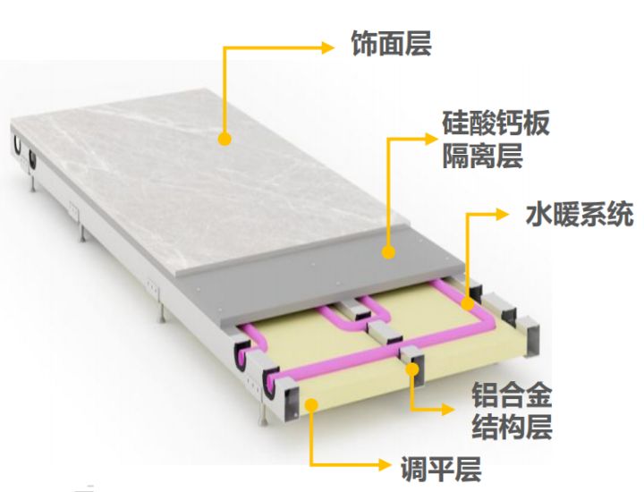 集成地暖地面系统架空型干式集成地暖系统是一种符合装配式建筑理念的新型地暖系统。通过多点支撑将基层板架空于楼板结构层,在基层板上侧安装地暖系统及地面饰面,在基层板下侧走水电管线。全系统干法作业,施工、维修简单。