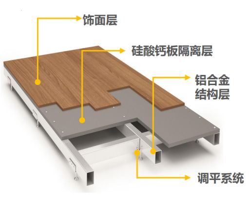 在地面不平整条件下,通过架空地板方式起到调平地面作用,从而完成安装地板基层,全程铺设采用干法施工,无需砂浆,木基层找平,面层可配套安装石材、地砖、地板等。即使二次装修时也可拆卸,基层可重复利用。施工现场环境无污染。可有效减轻楼板载荷,大幅度提高施工效率,缩短工期。