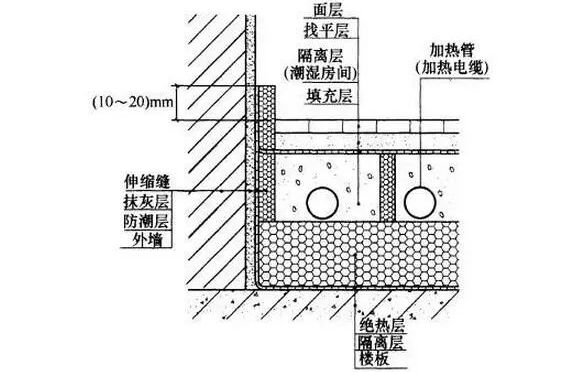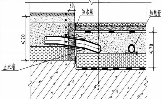在施工过程中,所有地板加热管道不得直接通过混凝土水障碍物,应沿墙跨越混凝土水障碍物。如果条件允许,淋浴间应增加一个隐蔽的地漏,位于地板加热保温层的下部,现浇填充层一般采用豆石混凝土,便于均匀传热。