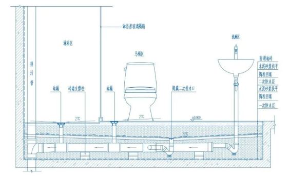 ①干湿区严格区分。可在干湿区交接处做一道刚性反坎,反坎从结构层开始施工,以将干湿区隔断开来,这样即使有明水(或水汽)进入砂浆结合层、隔热层,也无法到达干区,一定程度上避免卫生间门口水汽上升扩散。