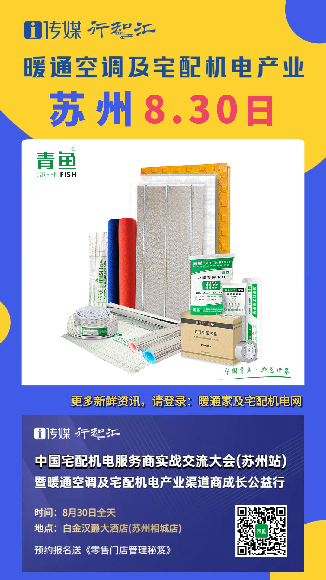 8月30日,中国宅配机电服务商实战大会(苏州)暨暖通空调及宅配机电产业渠道商成长公益行,将在苏州相城区白金汉爵大酒店拉开帷幕。值得一提的是,作为行业有序发展的引领者,青鱼也将全程鼎力支持此次活动,助力渠道企业经营质量提升,促进产业健康、有序成长。